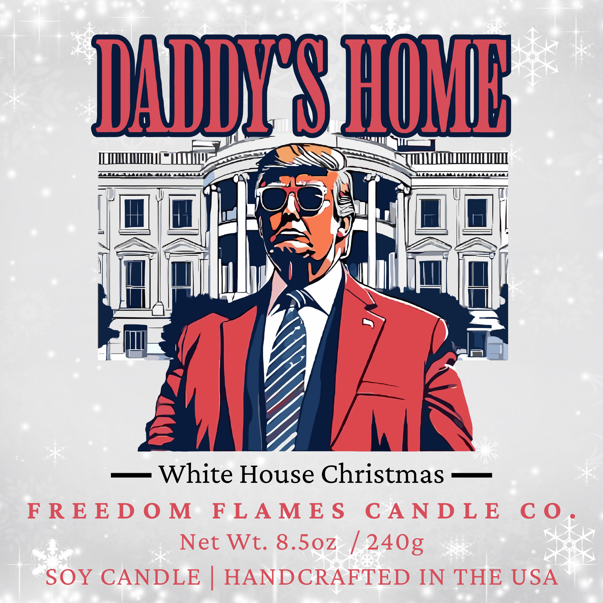 Celebrate the triumphant return of President Trump to the White House with our "Daddy's Home" candle. Infused with the nostalgic and festive scent of a White House Christmas, this 8.5oz candle fills your home with the crisp, piney aroma of a freshly decorated Christmas tree, evoking the warmth and joy of the holiday season.